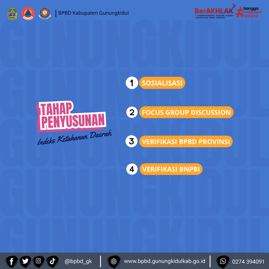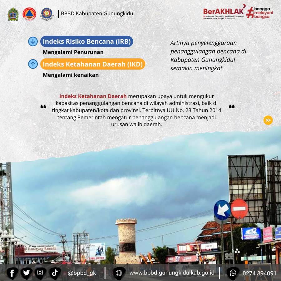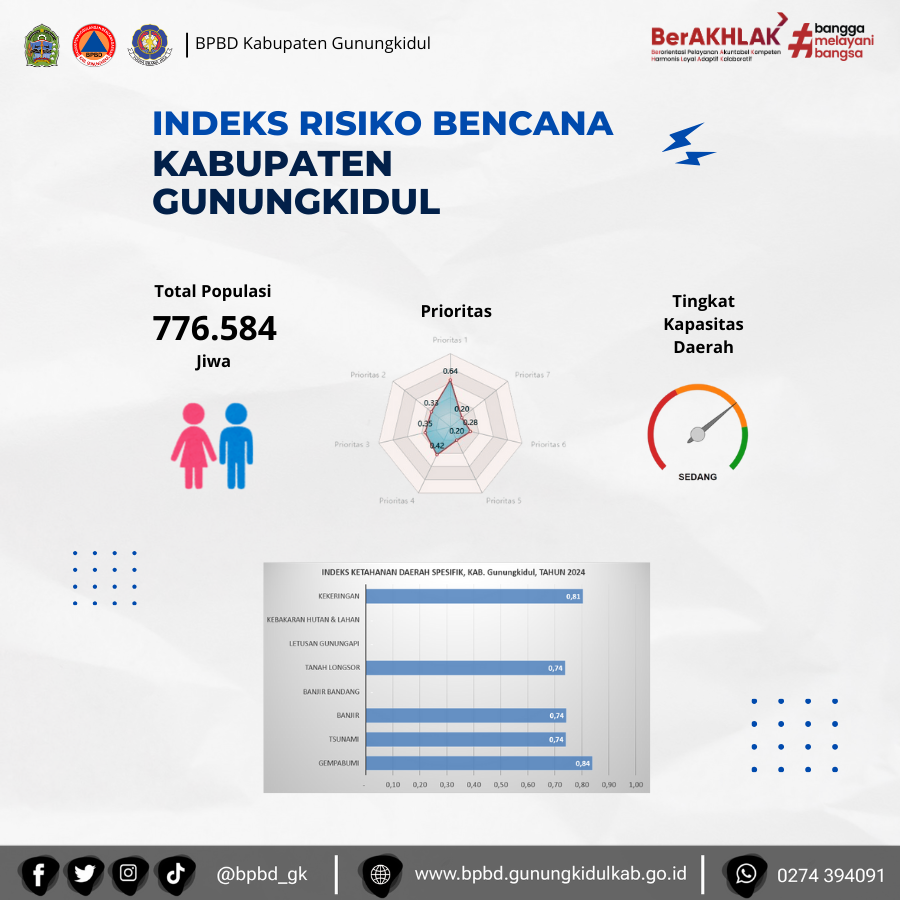 Indeks risiko bencana memberikan informasi mengenai perbandingan antara besarnya potensi ancaman, kerentanan dan kapasitas daerah dalam menghadapi bencana. Nilai indeks risiko bencana menunjukkan kemampuan daerah dalam upaya penanggulangan bencana. Semakin tinggi nilai indeks risiko bencana menggambarkan rendahnya upaya peningkatan kapasitas yang dilakukan oleh pemerintah daerah dan begitu pula sebaliknya semakin rendah nilai indeks risiko bencana menggambarkan upaya peningkatan kapasitas yang semakin tinggi oleh pemerintah. Dalam penilaian Indeks Ketahanan Daerah Kabupaten Gunungkidul terdapat 7 (tujuh) bencana yang menjadi potensi utama. Bencana tersebut meliputi banjir, cuaca ekstrem, gempabumi, kebakaran hutan dan lahan, kekeringan, tanah longsor dan tsunami.