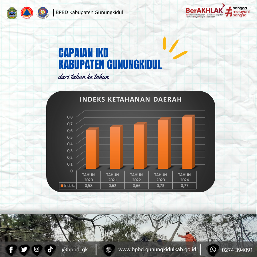 Terlihat bahwa capaian IKD Kabupaten Gunungkidul Tahun 2024 dengan nilai 0,78 dari target nilai 0,75. Capaian ini adalah suatu keberhasilan bagi Kabupaten Gunungkidul dalam rangka progres penurunan IRBI Daerah. Artinya telah ada upaya dari multi-stakeholders yang konsen, positif dan masif dalam pengendalian dan pengurangan risiko bencana di daerah.